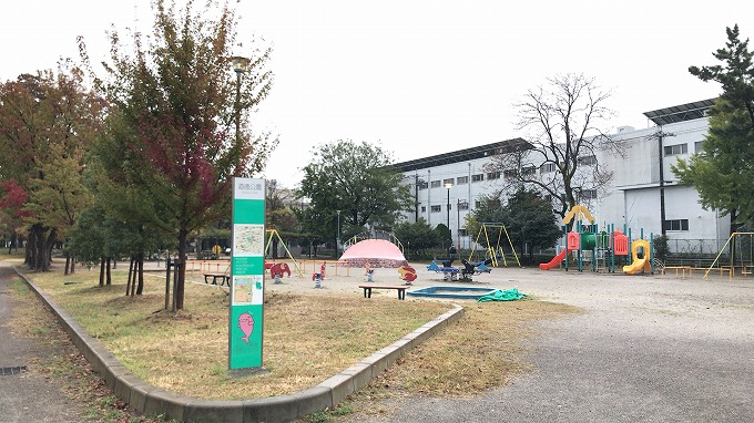 公園南側には名古屋市立道徳小学校、大江中学校が並んで立地していますが、かつてその敷地には映画撮影所・ボクシングジム・乗馬場などもあったようです。