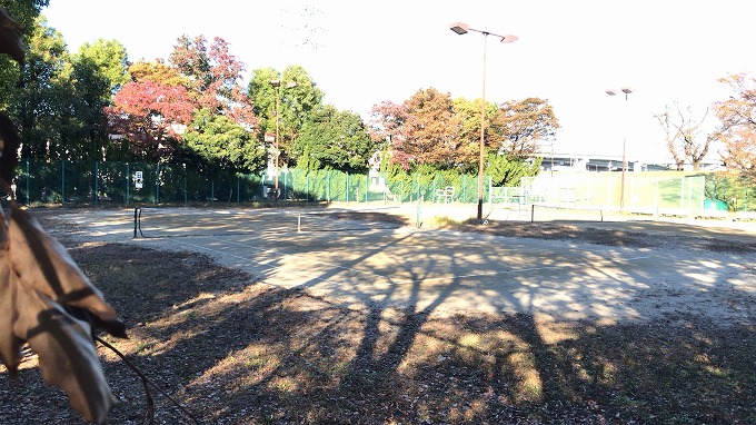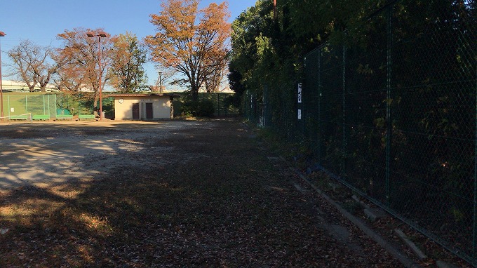 ●テニスコート全景 西側から撮影 雑草と落ち葉で荒れていますね。